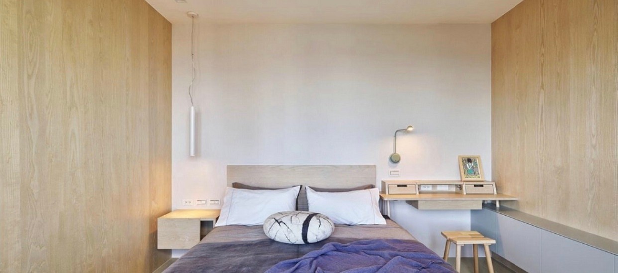 在空间极其有限的情况下,设计师利用餐厅区域一侧的走道设计了工作台,关闭吊轨滑门既与餐厅融为一体。