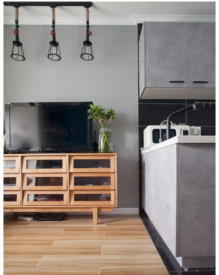 开放式的厨房,以深灰色六边砖地面,搭配复古调的灰色橱柜,布置出一个极简舒适的烹饪空间,让小户型也有着舒适的餐厨体验。