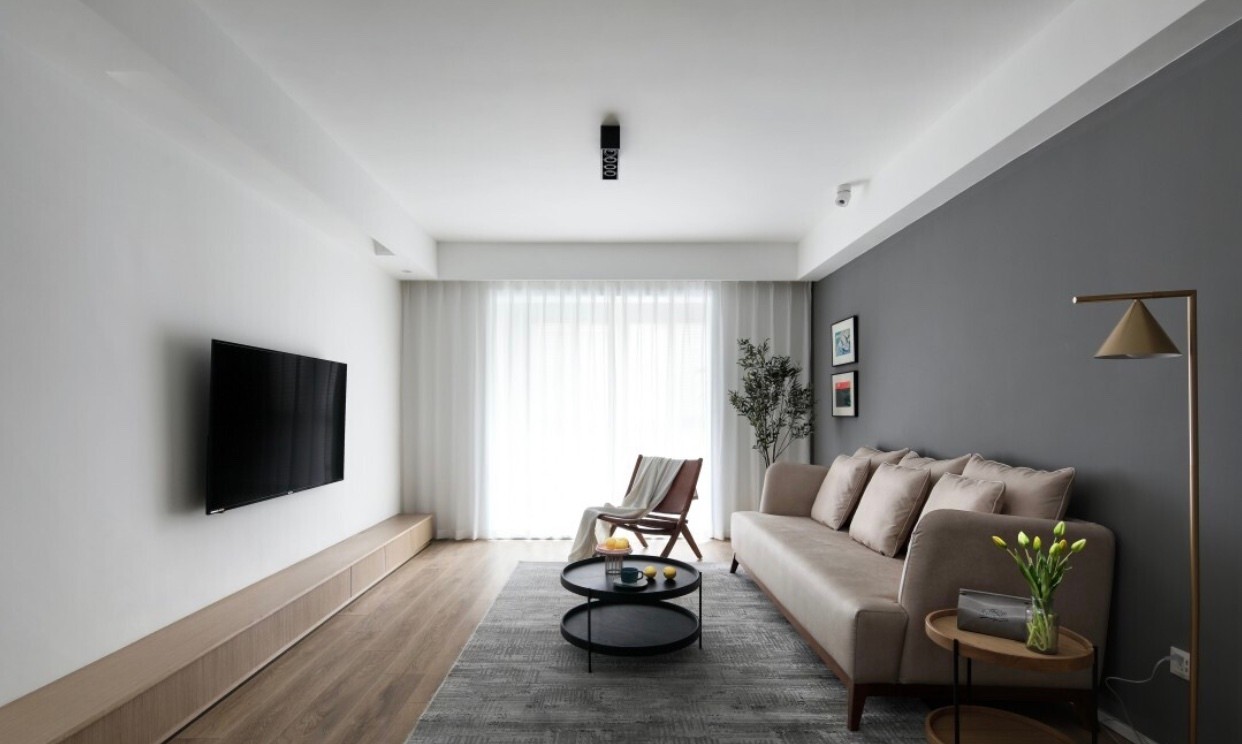 客厅主色调以灰白为主,软装上面通过暖色调来平衡空间,绿植点缀。