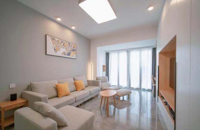 .客餐厅以一组有开有合的奶白色木饰面柜体打造电视背景墙,到顶电视柜与白色墙体融为一体,大量的面积留白,形成了视觉的扩容感。