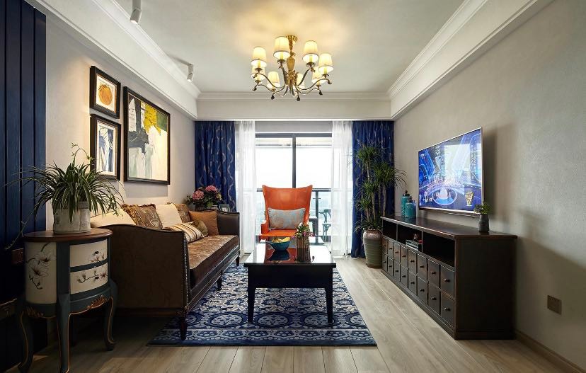 客餐厅晨光洒入,浅色背景墙辅助其将客厅的一桌一椅一茶盏、一灯一画一蓝毯刻画得更为立体,如晨映蓝语,温暖而不炙热。 2主卧一派舒适的木地板,厚软温软的大床与闲时赏景的贵妃椅,一切温婉自如得刚刚好,如清风白露,如山间暖阳。入门右手边做到顶的柜子不仅规避了卫生死角, 3白色瓷砖和透明玻璃隔断的采用让长条形的卫浴空间完全不显逼仄,干湿分区更便于日常清洁。 4厨房整体设计简约大方,L型橱柜解决了厨房的储物问