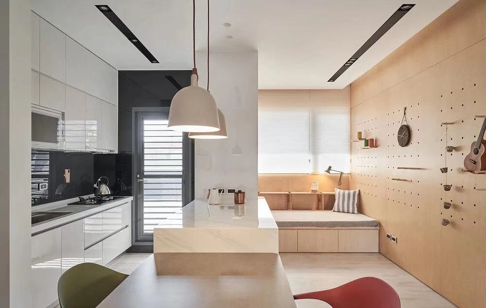 来与厨房的墙面拆除变成中岛,变成开放式厨房,中岛下方两面收纳,可随意变化的收纳使用。这是屋主妈妈说他更喜欢的位置,因为下午阳光就会从门外洒进来,坐在这里配上一杯咖啡多美好。