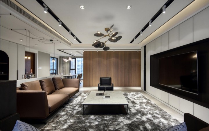 多光源照明的客厅,满足不同场合的需求。整面的电视机背景墙,收纳能力一级。吧台与沙发的整体感。吧台后隐形门,保证主卧私密性的同时,保证客厅的整体感。木质的温润感,中和了白色的冷。吧台,满足日常的一些无油烟的料理。餐厅的空间简洁又不失大气。