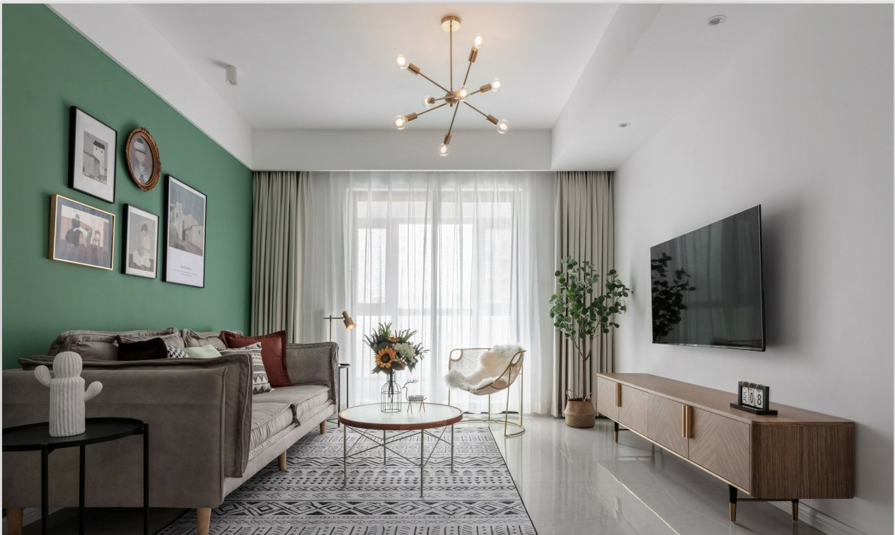 整个空间没有复杂的造型和多样的材质,大面积白色的乳胶漆搭配沙发背景墙整面生命力感的绿色,来作为整个空间的打底色,搭配浅色窗帘、沙发和地毯,与抱枕、插画、台灯的内饰做家居点缀,给人比较小清新的感觉。