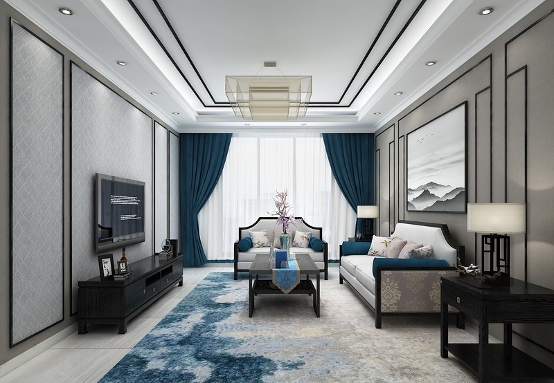 客厅线条利落简洁,从背景墙便可感受到几何艺术,在加上材料与用色上的迥异,带来一种动律;新中式家具不仅质感上乘,也因为软装和配饰的衬托,更显端庄和大气。