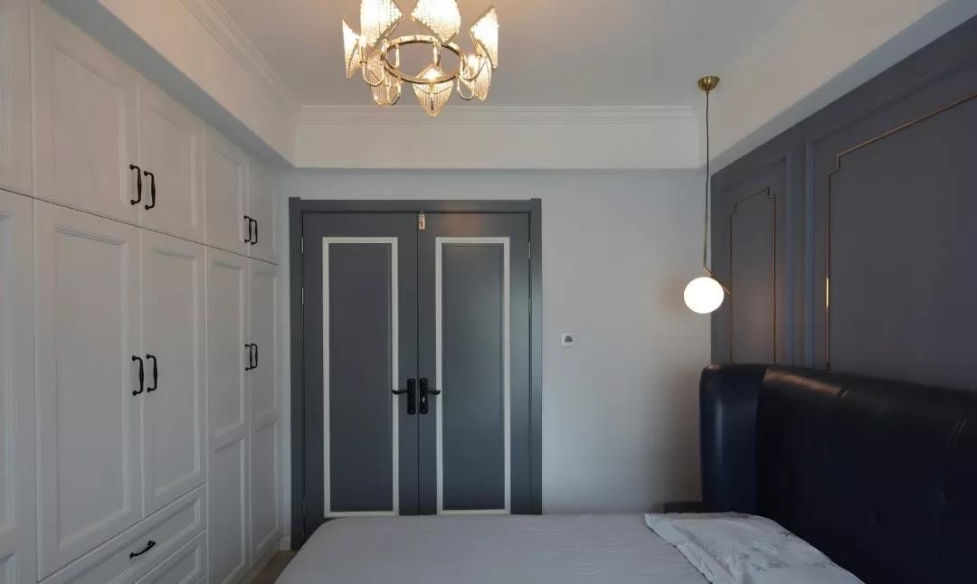 卧室门采用加高木门,***与整体灰蓝色相呼应,主卧室双开木门更加大气