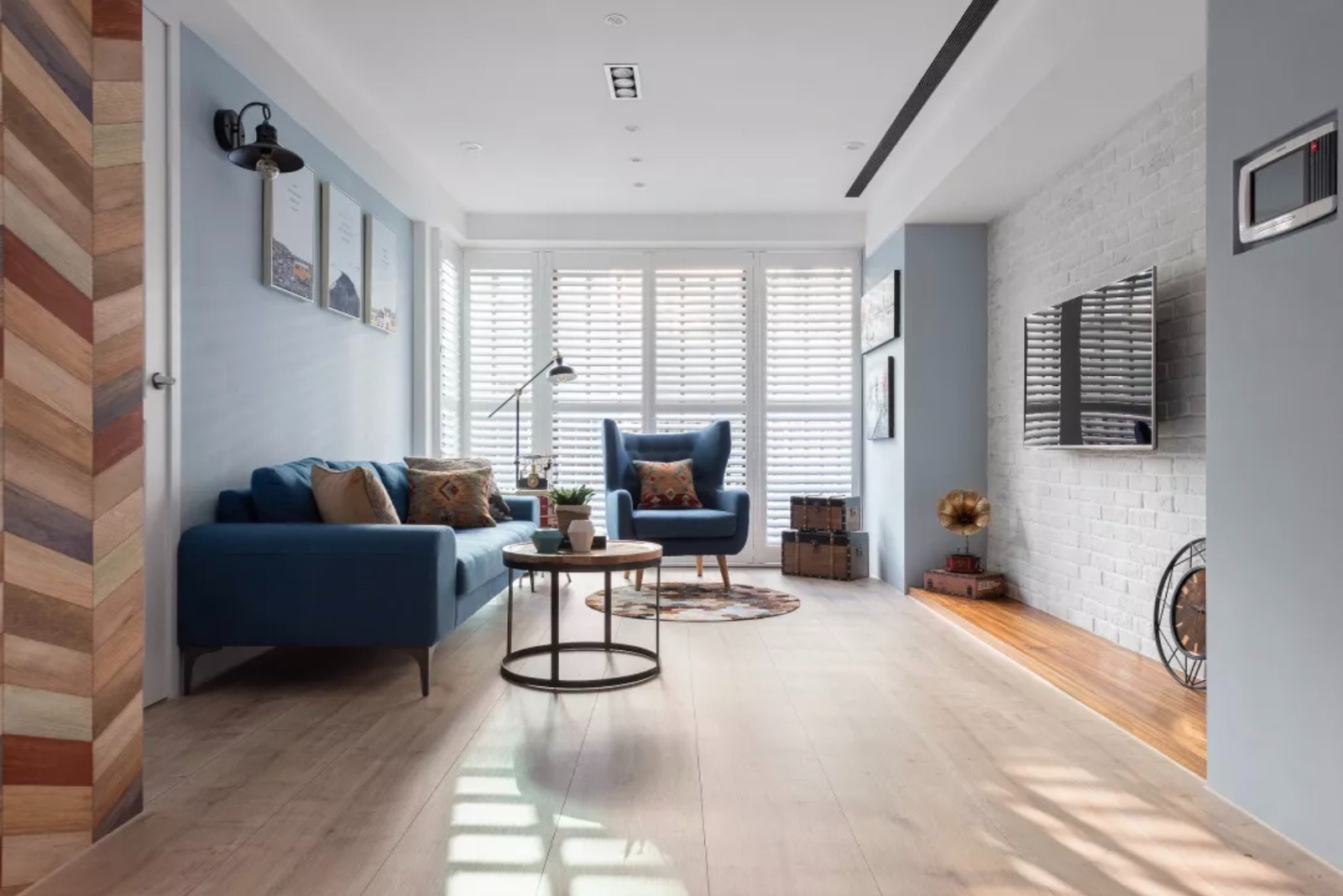 客厅选用了英国***蓝作为墙面主色,高贵大方,搭配木地板和白色百叶窗,让人放松,也是一家人三口休闲、***的好地方。