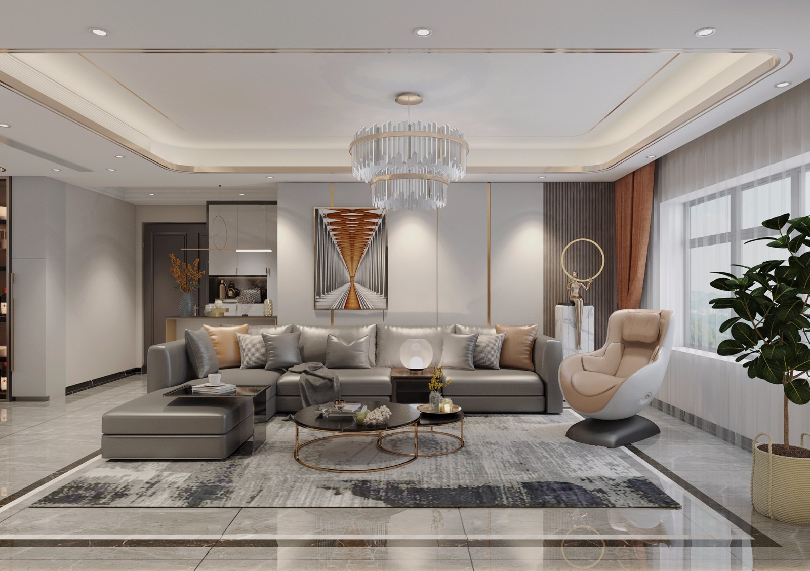 业主考虑现在轻奢风格并且全屋中央空调,在吊顶采用矩形吊顶加等待的设计,矩形吊顶的基础上增加了镶嵌了金属线条。
