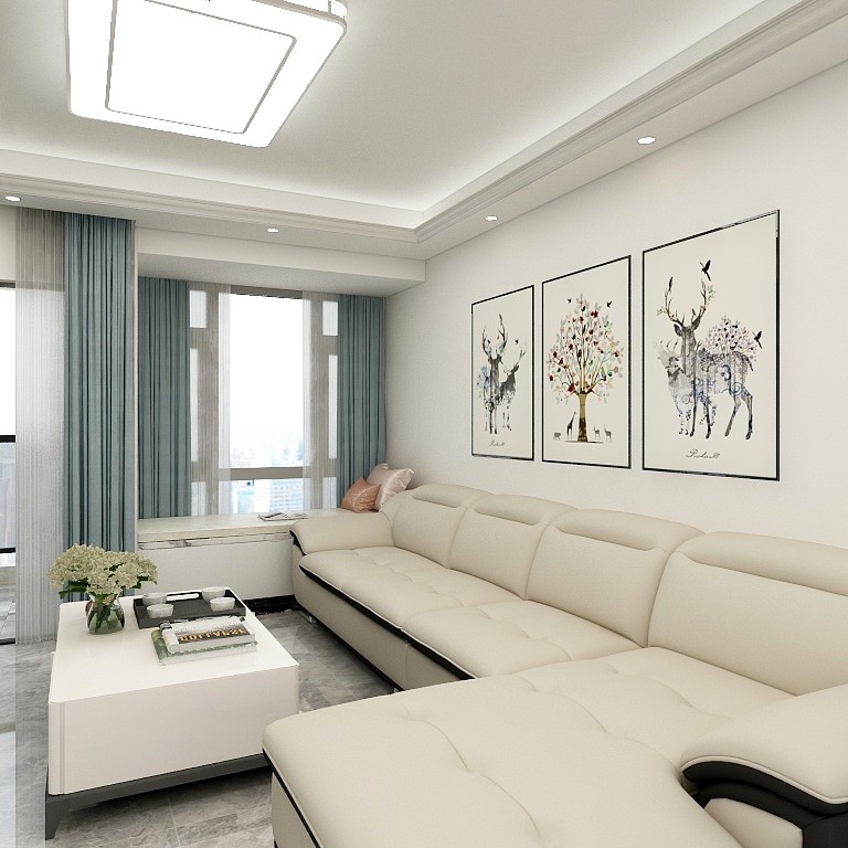 客厅天花采用回形吊顶,墙壁放置几幅比较有艺术性的挂画,放置一张纯色的真皮沙发,简洁大气。