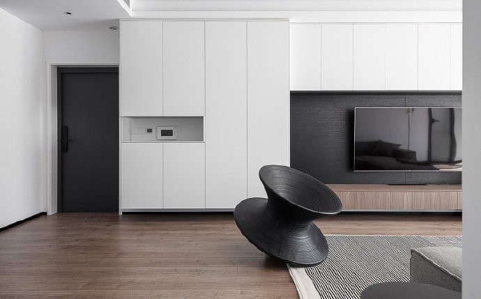 客厅正面的定制柜子融入到影视墙里