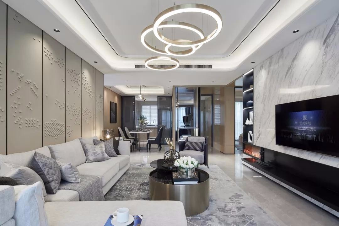 这是一套128平米的现代轻奢风格装修案例,整体装修采用了较多的现代感的设计元素,结合上端庄华丽的金属、玻璃元素,并以圆滑的线条,营造出一个华丽优雅的浪漫氛围感。