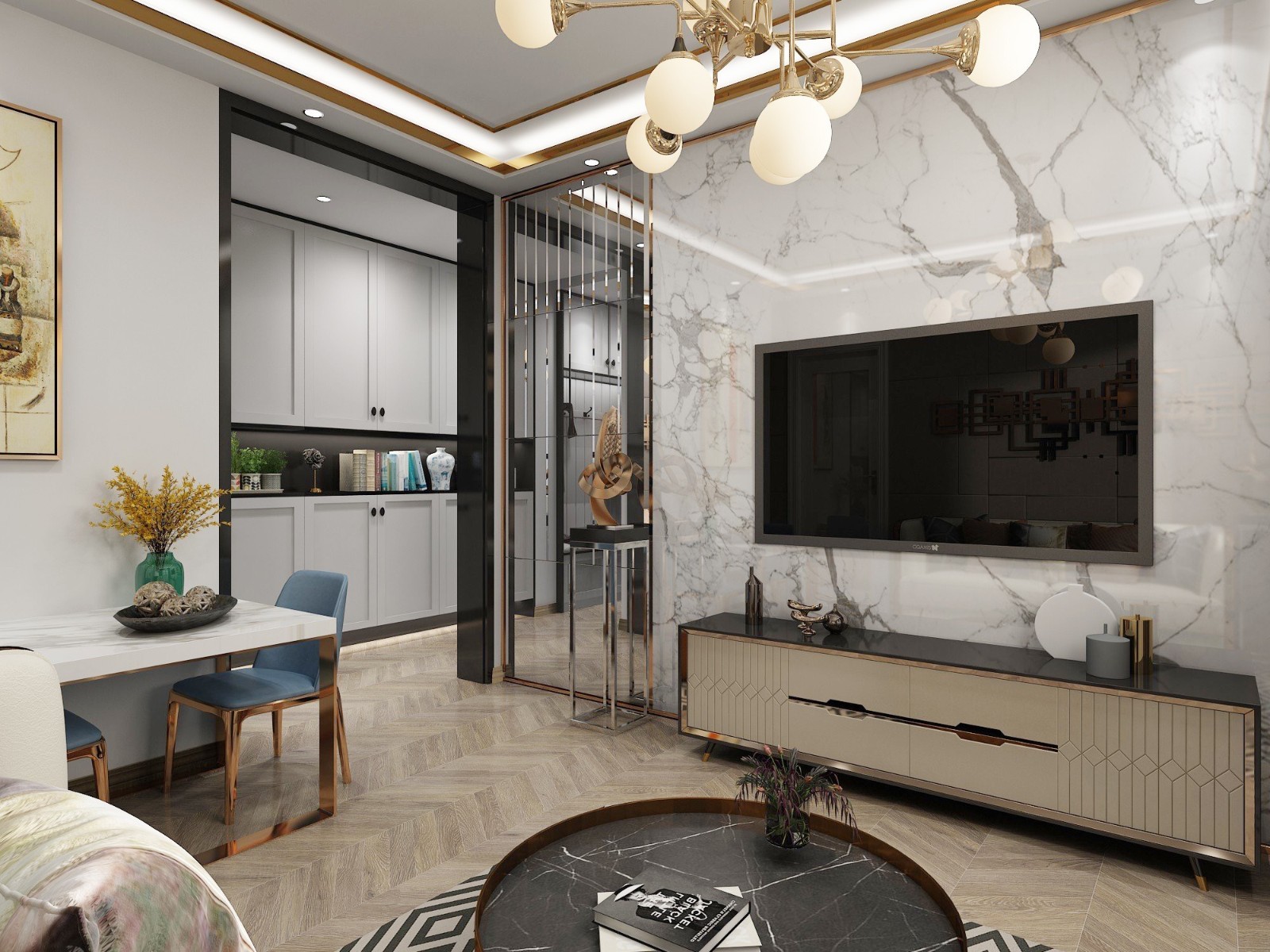 精选的电视柜,黑色的茶几金色的吊顶,一切都在材质中体现古典,传统。灯光透过影视墙面上的大理石,整个空间温馨又浪漫。