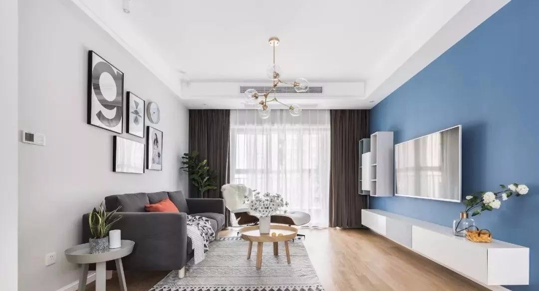 客厅地面通铺木质地板,墙面采用蓝灰两种色调,视觉上具有层次感。