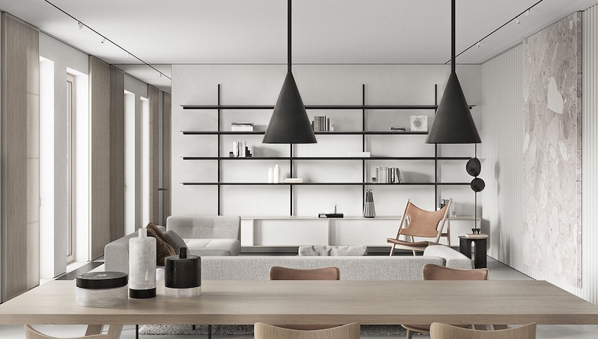 本案全室规划中,木格栅亦为空间增添一抹禅意,同时顾全住宅紧邻的隐私性,以格栅滑门筛落邻居视线和光线,更利用之做为隔间,以流通视觉暧昧界定领域分野,换来通透的空间感。
