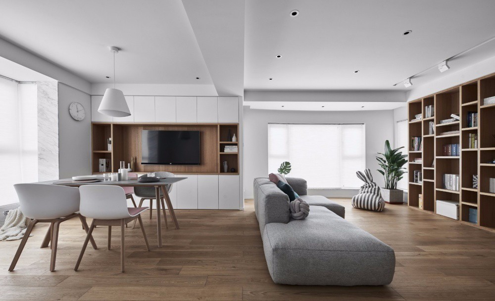 打破了传统客厅的定位和布局,除去电视墙,茶几,多人沙发组,以超大落地窗,整面书柜的形式,通过所有可自由移动的家具营造出轻松、不受拘束的亲子空间。在陪伴孩子成长的过程中,让这个家,带来无限的可变。