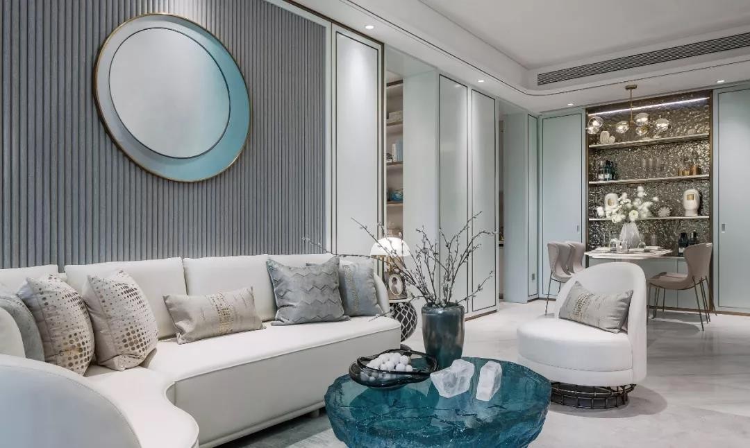 从玄关转入客厅,浪漫感、幸福感扑面而来,灰白底色的柔和调性,被蒂芙尼蓝星星点缀着,令人眼前一亮,放松身心。这种现代简约的构造,勾勒出一个精致优雅的蓝色风情家,让人身处繁华的闹市中,心情也能平静舒畅。