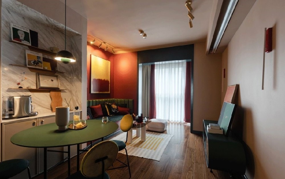 沙发也是我们现场制作的,靠墙卡座的造型,上优化了原本窄小的客厅。材质特意选择了丝绒面料,橄榄绿与饱和度极高的橙红色墙面碰撞,迷幻感十足。