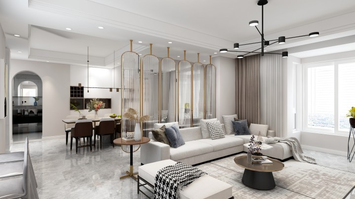 客厅整体使用白灰色调,显得客厅更加大气,视野开阔;餐厅与客厅之间隔断,用于区分空间