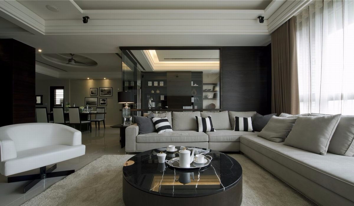 中空吊顶设计。米白色沙发,重色的家具,体验***空间家居效果