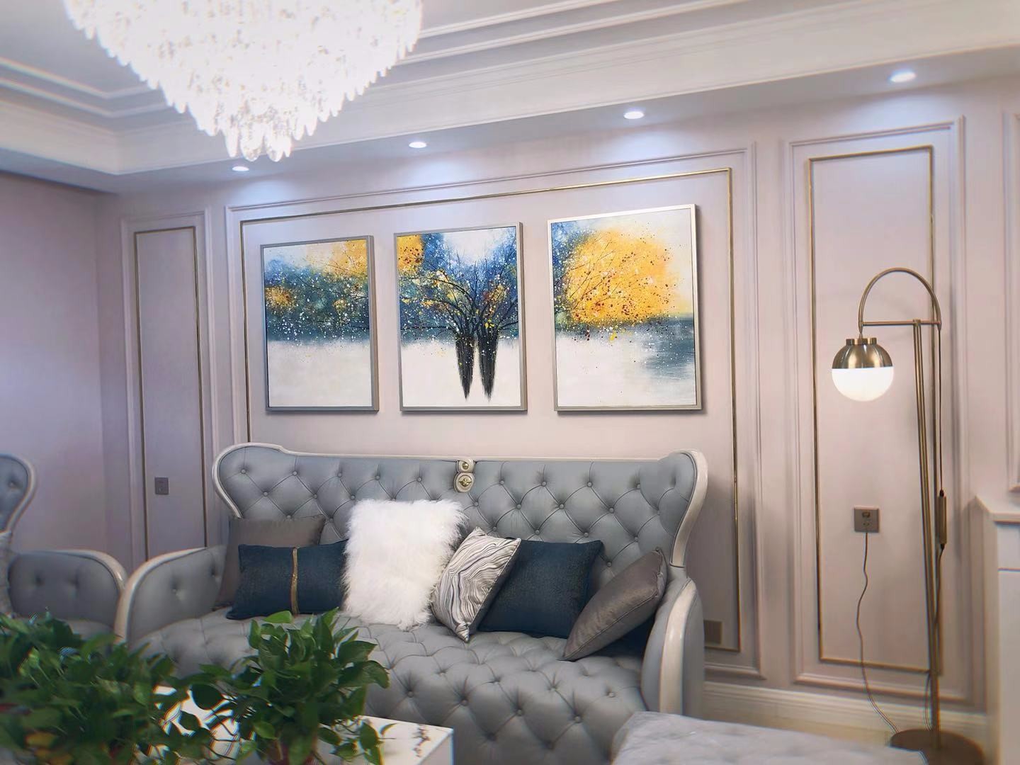 女业很浪漫 客餐厅区域空间墙漆采用香芋粉 采用石膏线和金属线条营造轻奢美式的氛围