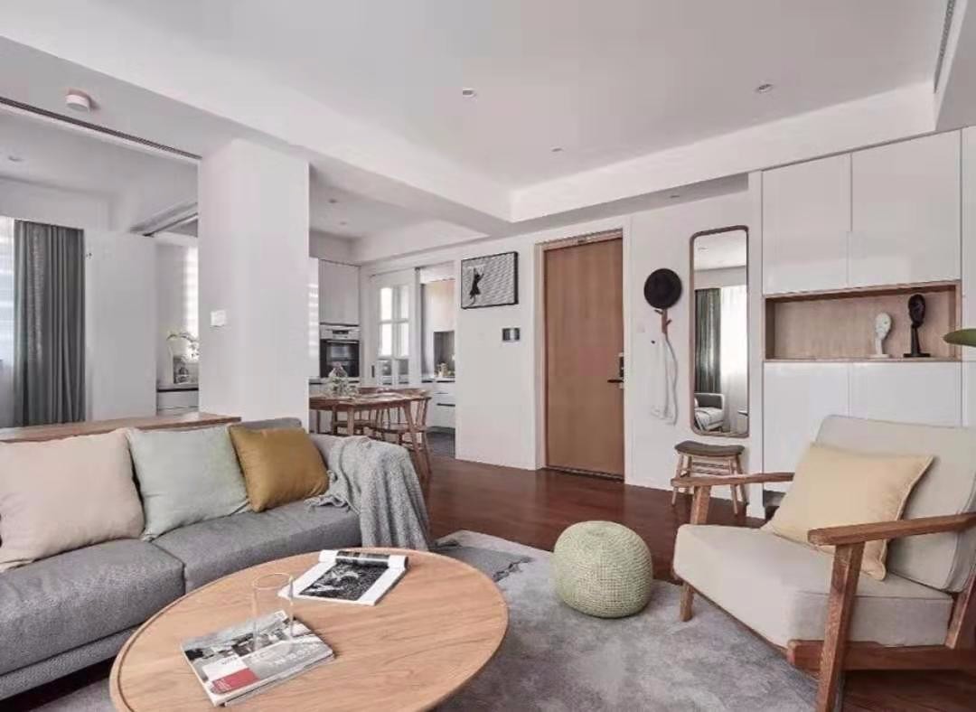 客厅的地面选用木地板,使得空间看起来更加的温馨一些。