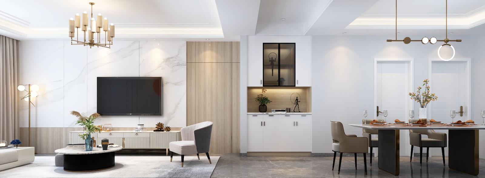 原木与大理石, 两种材质以极简的方式, 构成了整个客厅空间的清冷底色。