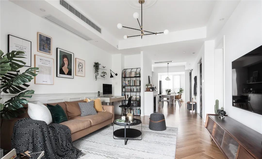 客厅的角落里放了一张小书桌和书架,驼色沙发搭配白色背景墙,点缀森系装饰画和绿色植物,打造北欧小清新的感觉。