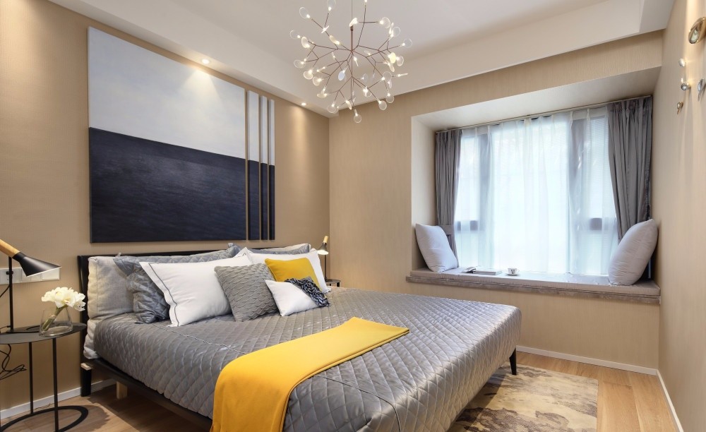 卧室整体以暖色为主,点缀黄色,提亮空间