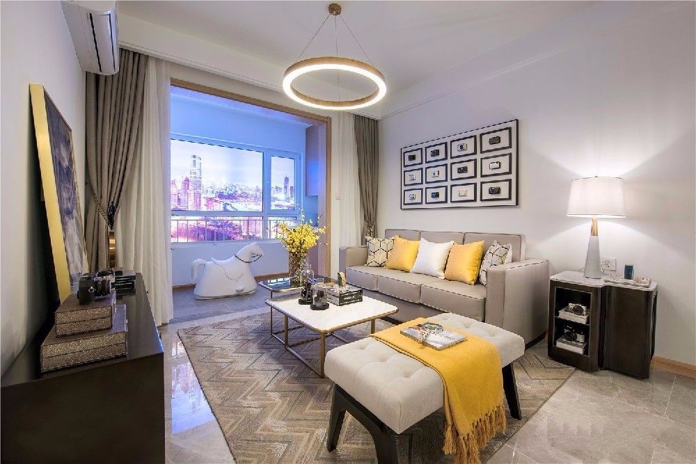 阳台与客厅相通,空气流通好,米白色墙壁与暖光色灯光相映,下班后回到家中与另一半倍感温暖。
