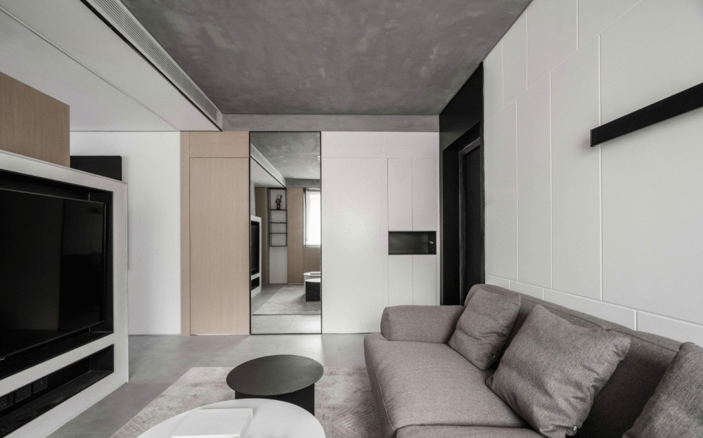 客厅顶面做了水泥质感的艺术涂料,自带质朴天然的纹理。沙发背景墙是石膏板造型墙,设计成不对称的线条组合,黑色横线条是线型灯。