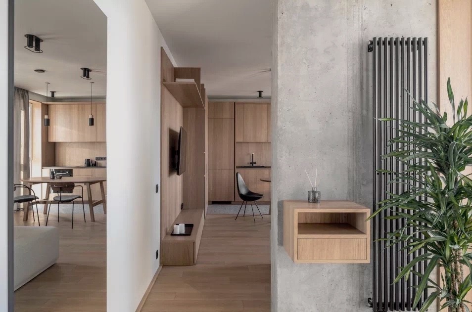 ,否定过道是个独立的个体,他将过道与其它功能区连为一个整体,从延续使用的橡木元素、混凝土、黑色开关、普鲁士蓝的摆件就可以看出,其次是将它充分利用,定制的柜体不仅提升了空间的储物量,还因为功能性的的使用而减弱了过道的弊端。