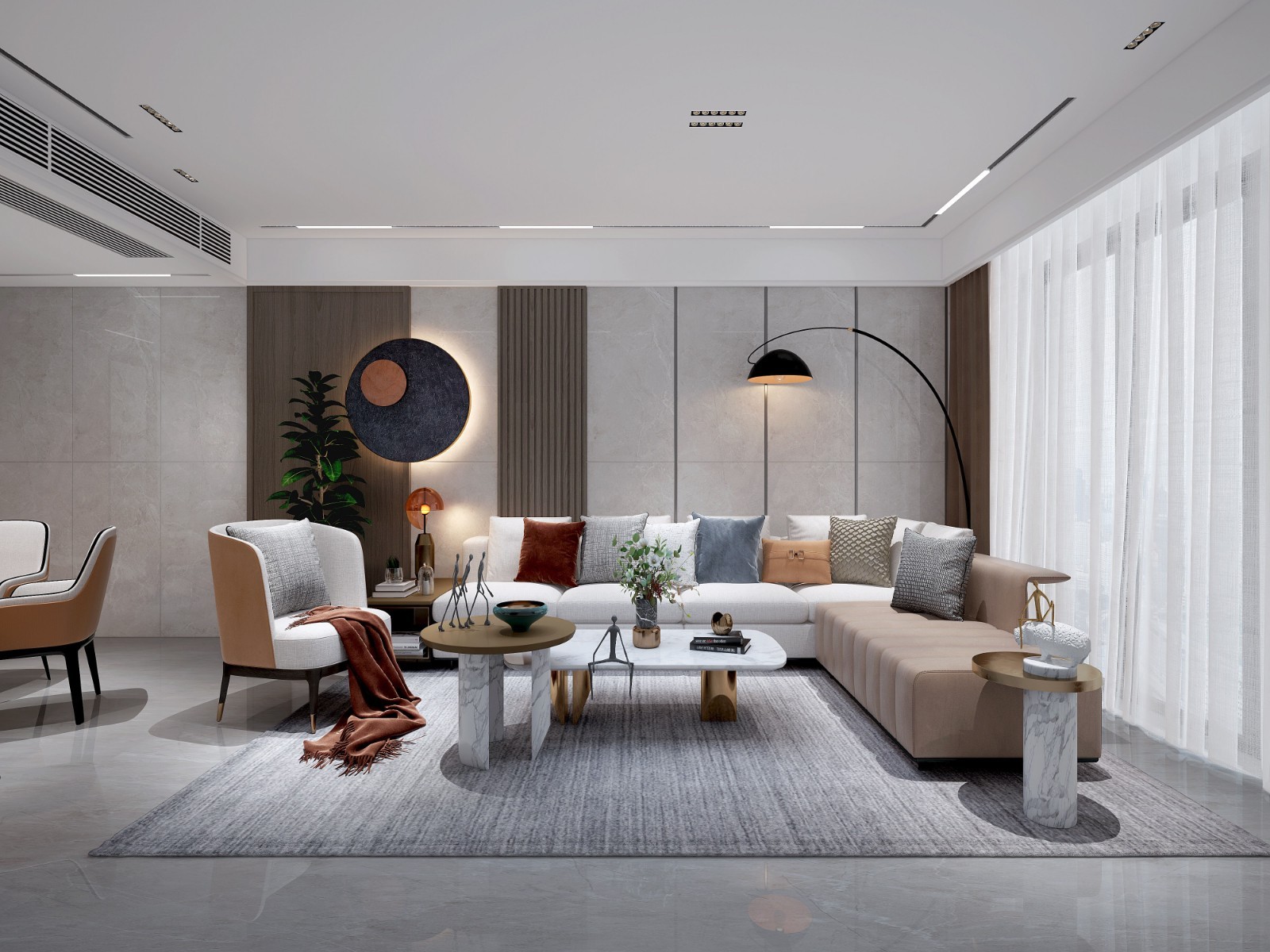 在材质上,电视背景墙使用了西班牙深灰色大理石和樱桃木面板,使空间显得简约、大气,同时木材给人感觉温馨,石材给人感觉大气
