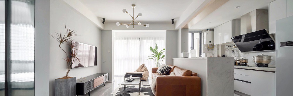 客厅处将厨房这面墙敲掉,用吧台作隔断,阳台内包,原本规整局促的客厅就开阔了许多。
