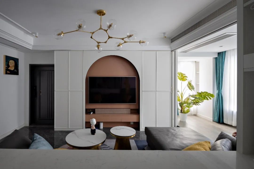 将客厅与阳台的墙体去掉,自然光完美引入,电视墙背景做了可供收纳的柜体,中心部分加入拱形设计,丰富空间几何感,莫兰迪色***又耐看,也流露着十足的温馨。