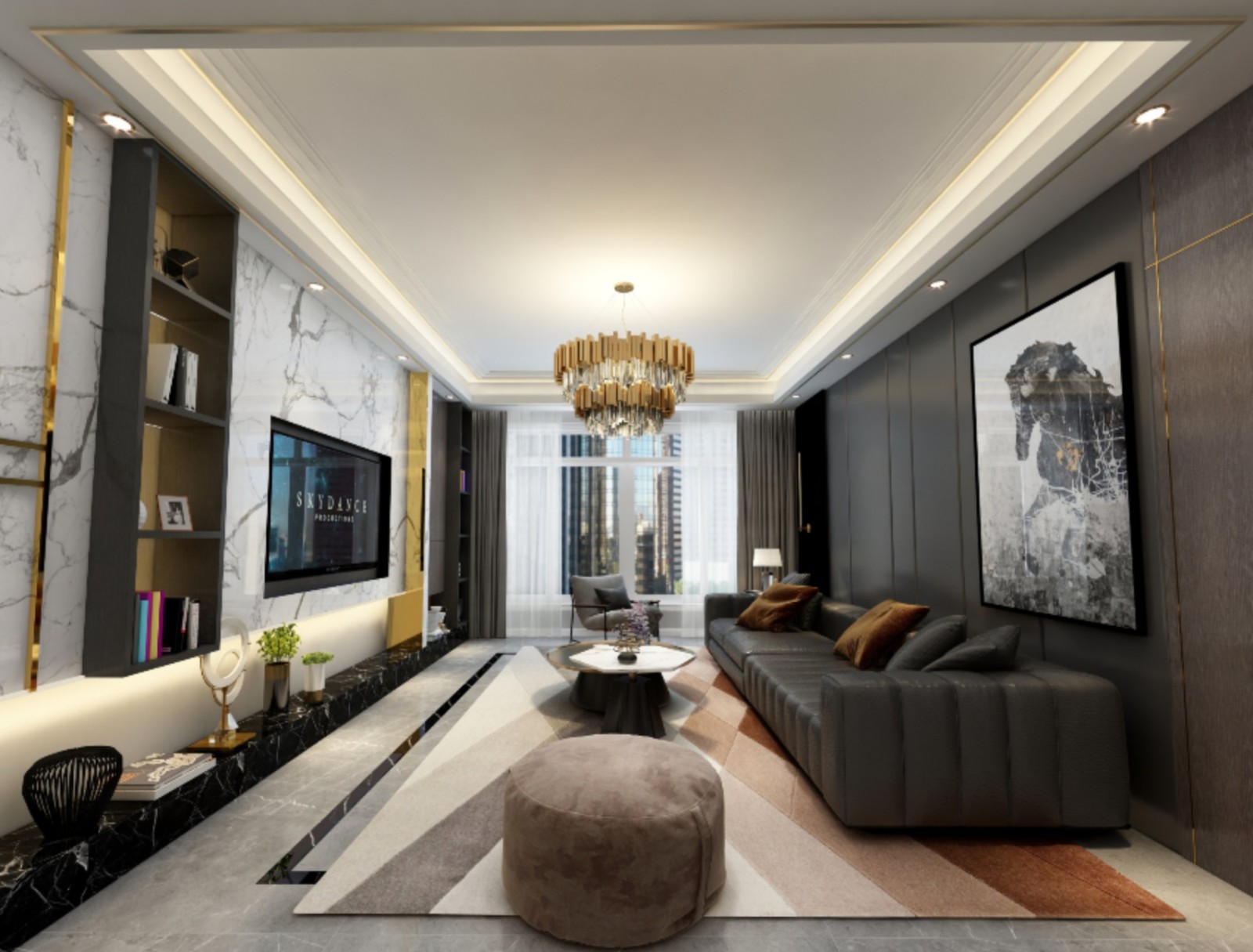 客厅使用了大量的石材以及金属线条凸显轻奢风格的元素,整体色调采用低调的深色以及简洁的白色,让客厅显的内容更加丰富