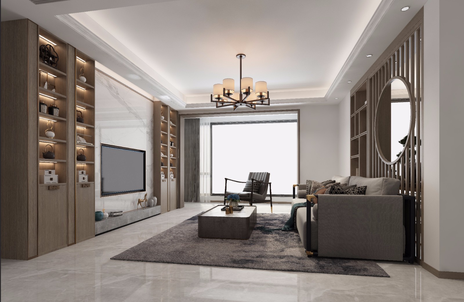 本案例为新中式风格的四室两厅,以体现中国传统文化与现代生活需求的完美结合为主,