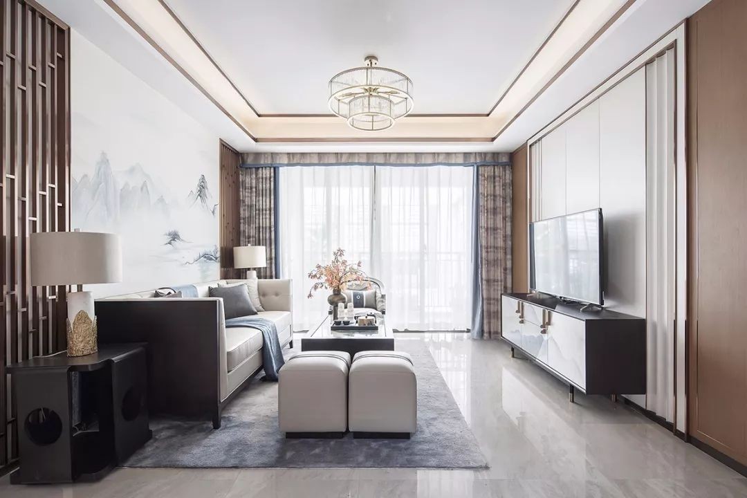 客厅入眼是国民清雅生活的场景,沙发、电视机背景墙相对称,呈现中式风的端正和气派,结合现代家具装饰让空间时尚魅力。