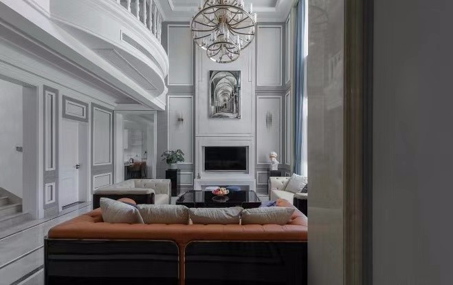 白色和雾霾灰为主的护墙设计,为客厅增添了奢华大气的质感