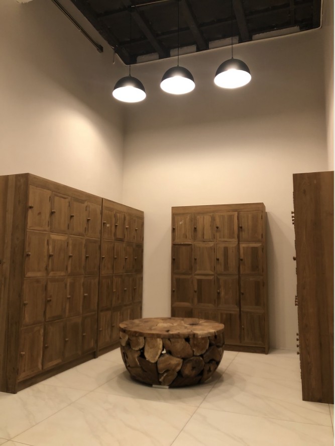储物柜的设计,设计师采用的是原木色的木头材质,体现老物件的风格
