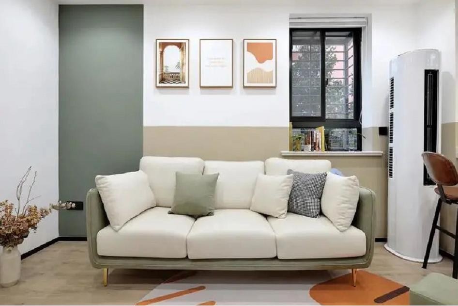 沙发靠窗摆放,豆沙绿+奶茶色分色墙面与沙发颜色相互呼应。素雅的格调通过各种软装搭配,打造出一个温馨舒适的空间。