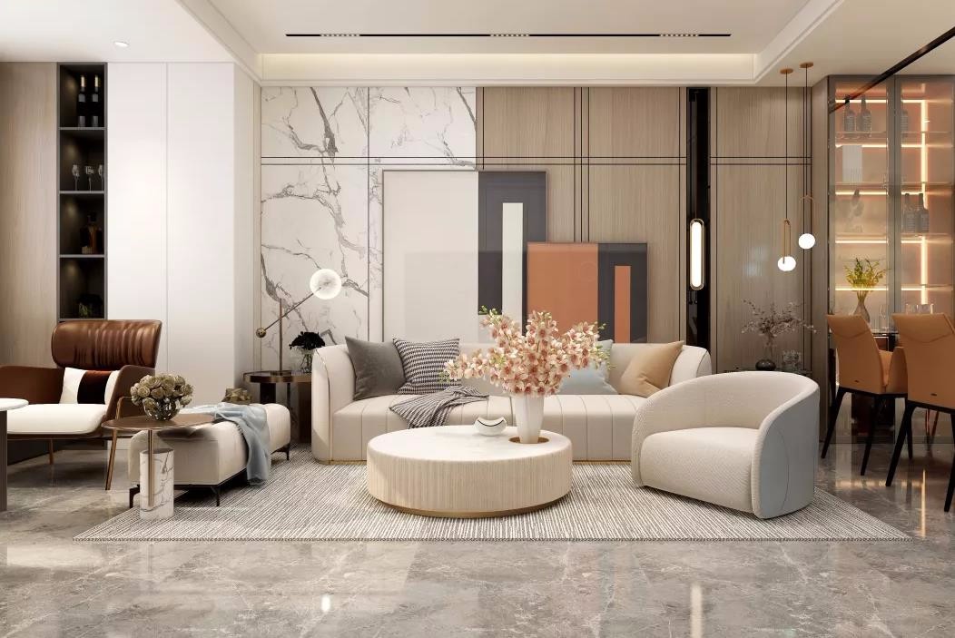 客厅沙发背景墙做了石材和木饰面的拼接造型,局部也运用了磁吸轨道灯,整体搭配合理,高端大气。