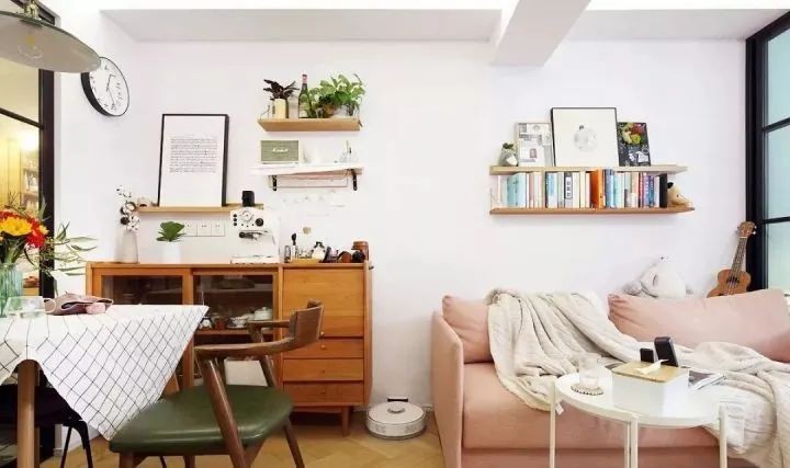 餐桌旁边搭配原木餐边柜,兼顾水吧台功能。墙面的木质隔板起着收纳和装饰作用。粉色沙发和床品一致,漆面小圆茶几精致简单,空给人一种宽敞且清新怡人的感觉