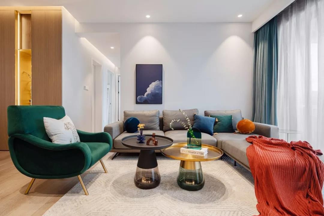 蓝绿红的抱枕与饰品,金色玻璃拼接茶几,异形花瓶等元素的采用,既增添色彩活力,又让客厅具备满满的,设计感和新鲜度。