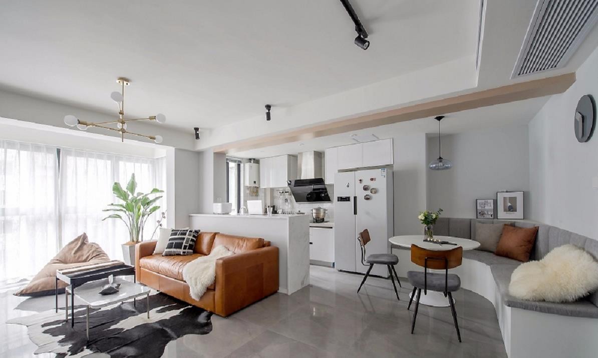 这是一套现代风格的装修案例,设计师根据屋主的生活习惯,将次卧改造成榻榻米房满足基本需求;将厨房这面墙敲掉,用吧台作隔断;最有创意的是圆弧折角卡座,仪式感爆棚。