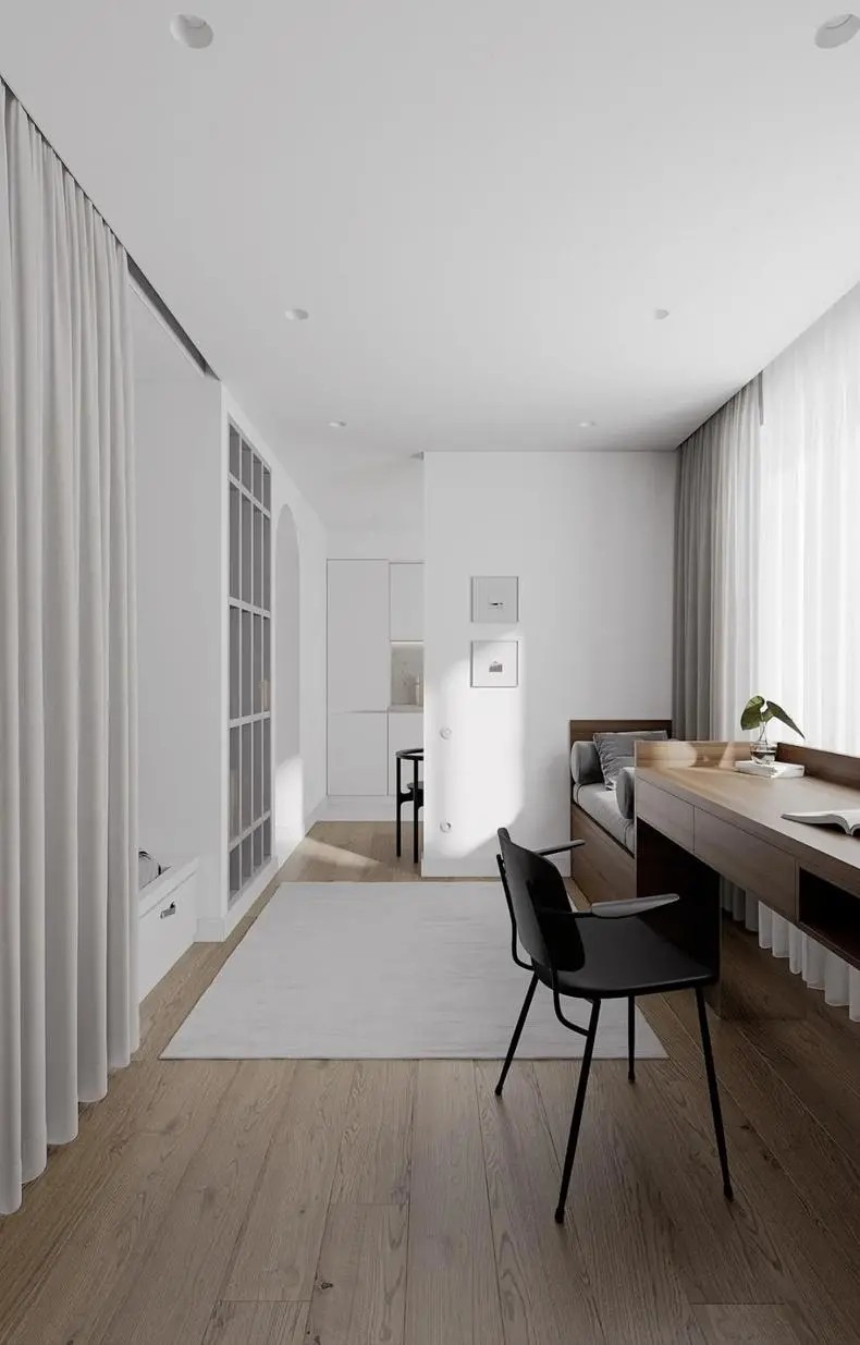 空间分割用了布帘,休息时拉上便是私密空间,平时拉开就把客厅空间归入卧室