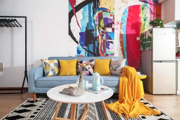 客厅墙面用了一副涂鸦元素的墙纸,由于色彩对比跟强烈所以并没有贴满一整面墙,而且贴了一般其它留白。