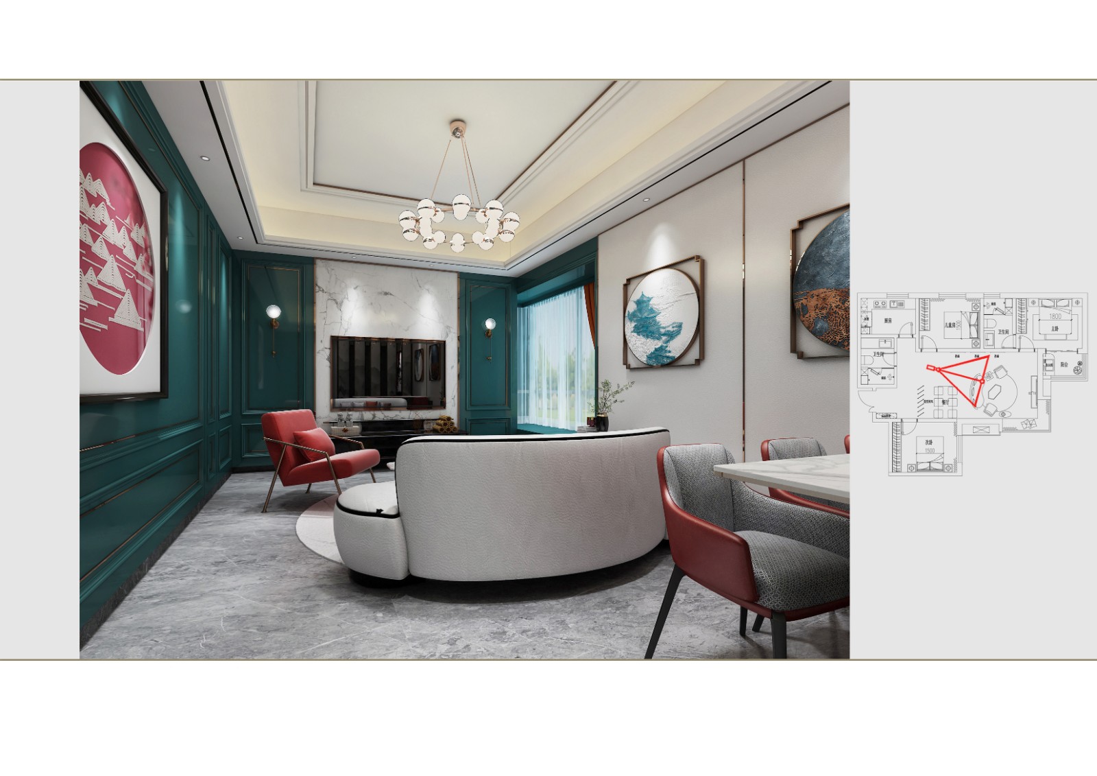 客厅大胆使用绿色作为混搭新中式的主调颜色,现代的家具选配,中式的软装挂饰搭配。