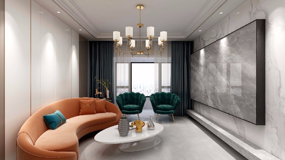 圆形-橙色沙发,配上墨绿单人沙发,提升客厅的活力。