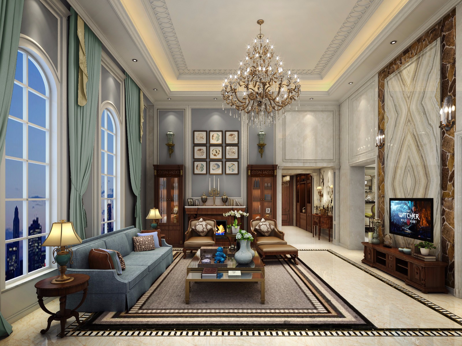 客厅中空设计,透光石电视背景墙,美式家具摆设完美结合