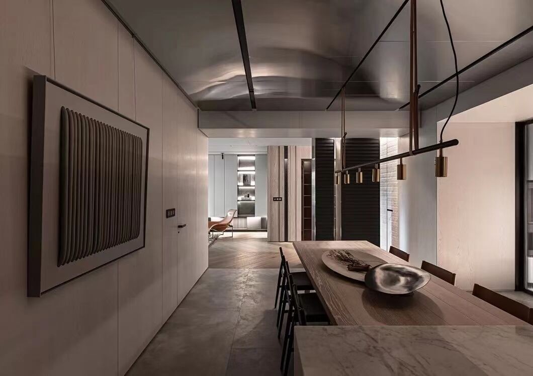 本案例为270平大平层,整体的设计概念中我们希望达到空间的流动感,透过不同型态的墙体脱离架构,让材料能延伸、光线穿透、空间放大的体验。